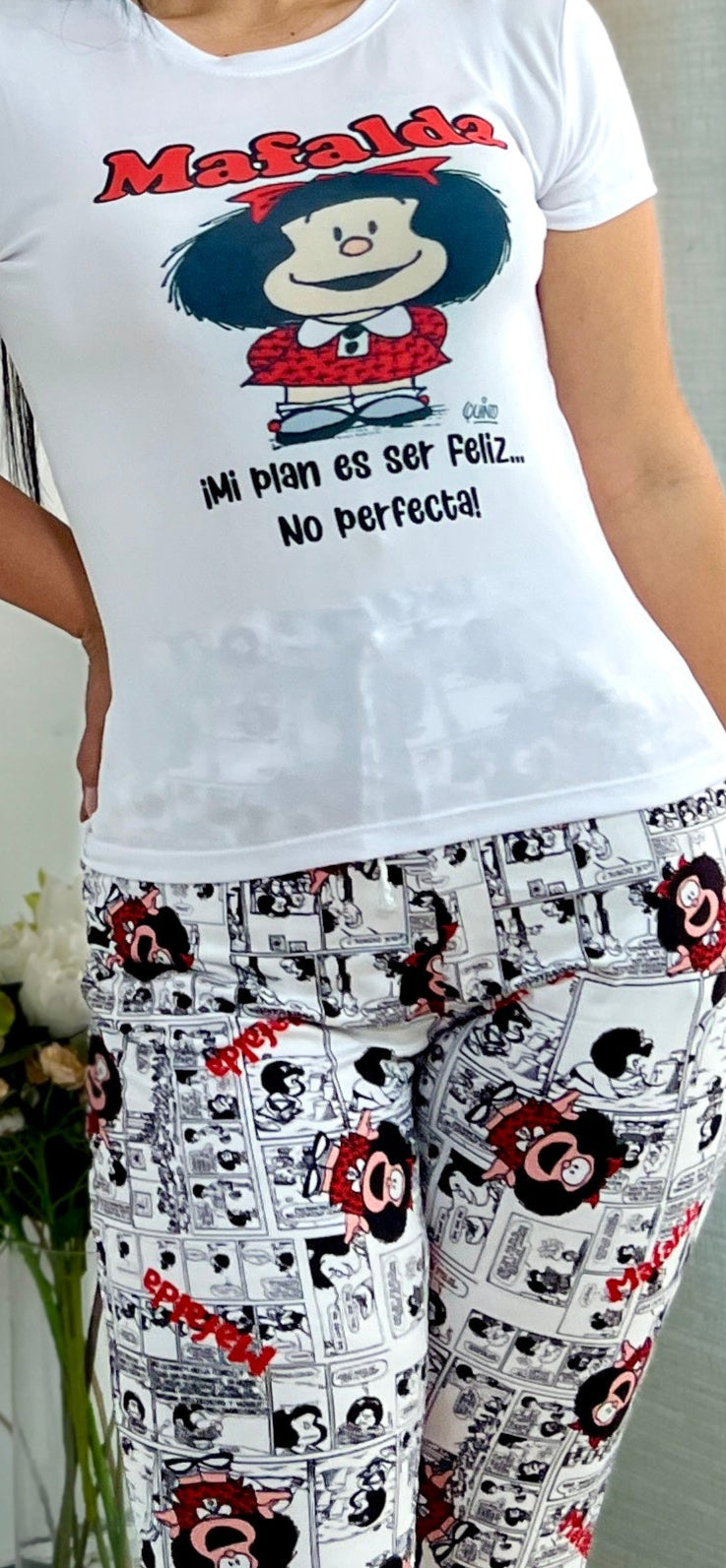 Mafalda nunca pasa de moda, y esta pijama lo confirma. Confeccionada en tela brush tipo piel de durazno, suave y delicada con tu piel, esta pijama te abraza con comodidad mientras disfrutas tu descanso o tu serie favorita.