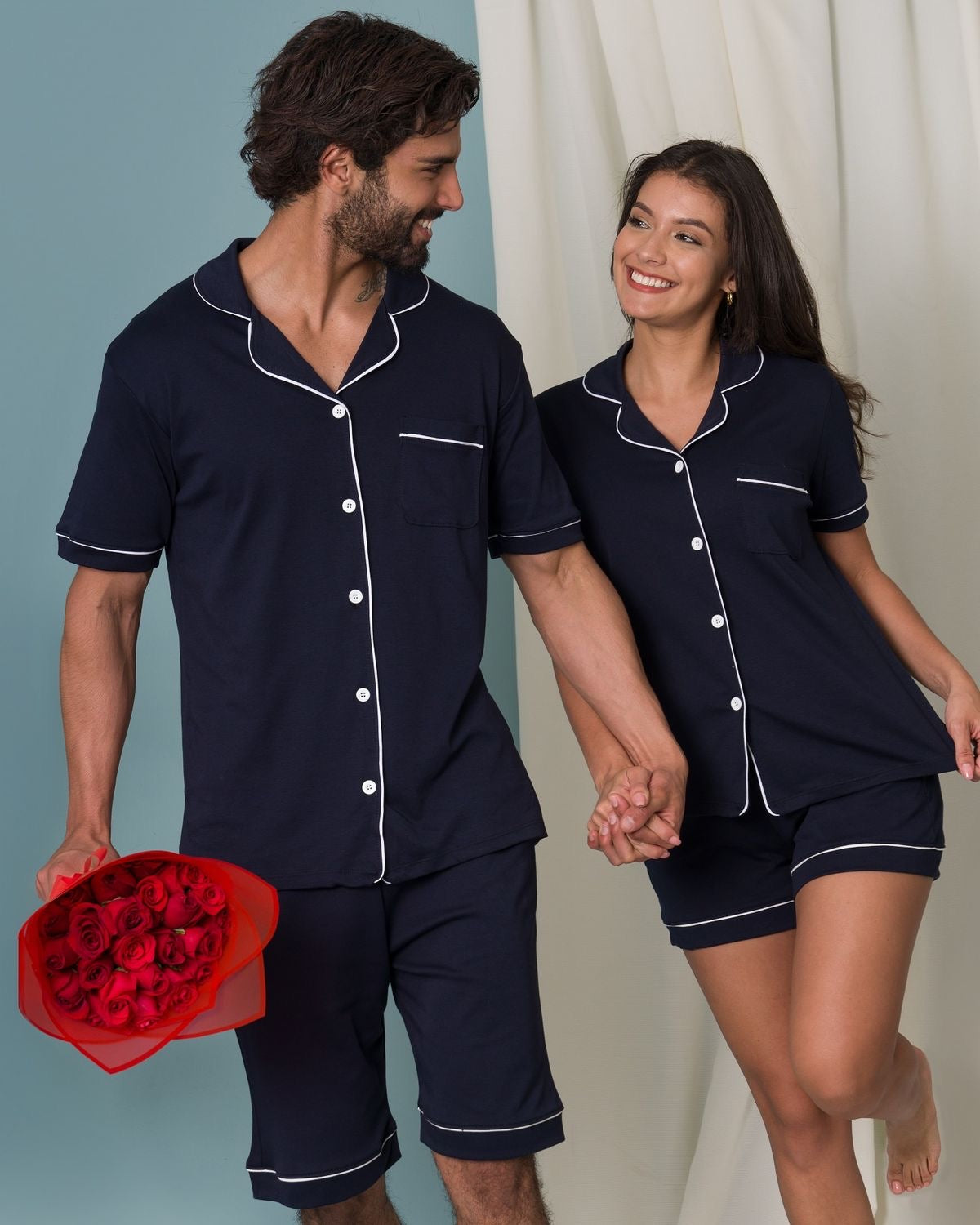 Nuestra pijama de pareja en tela brush suave es perfecta para quienes aman dormirse y despertarse juntos, con el corazón abrigado y el cuerpo cómodo.